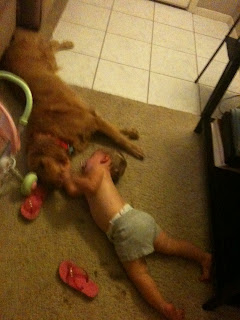 I never thought we would EVER get another dog after our last puppy catastrophe. When Katie was 5 months old, we got an adorable German Shepherd puppy but I was woefully unprepared for the daunting task of raising and training a puppy (they are worse than newborns); so I begged my husband to give the puppy away after a week of getting no sleep. I had made up my mind that I just wasn't an animal person anymore. Well, little Katie adores dogs (as does my husband) and so when we heard that some friends could no longer keep their 3-year-old Golden Retriever, who was already trained, we decided we would take her. Ginger has been a wonderful dog. She sleeps on her bed in my room at night and never disturbs me. Katie and Ginger have a special bond that is just adorable. I have found them lying on the floor together before bed.